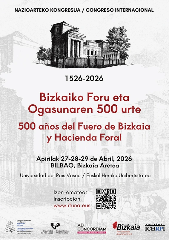Del 27 al 29 de abril de 2026 tendrá lugar en Bilbao (Bizkaia Aretoa) el XVI Congreso ITUNA «500 años del Fuero de Bizkaia y Hacienda Foral (1526-2026), organizado por el Centro de Investigación y Documentación del Concierto Económico y las Haciendas Forales de la EHU. En dicho congreso participarán dos miembros del grupo. Por un lado, Óscar Álvarez Gila presentará el trabajo «Del ocaso de la foralidad al renacimiento euskaro: los ecos de la abolición foral en la diáspora vasca de América (1876-1921)»; por otro lado, Mikel Gómez Gastiasoro –que se reincorporará en breve de manera oficial al grupo tras la formalización de su contrato postdoctoral– disertará junto con Felipe Sobrinos Bueno (del IELAT – Universidad de Alcalá) sobre la figura de «Manuel Antonio Luzárraga: marino vizcaíno y oligarca ecuatoriano».